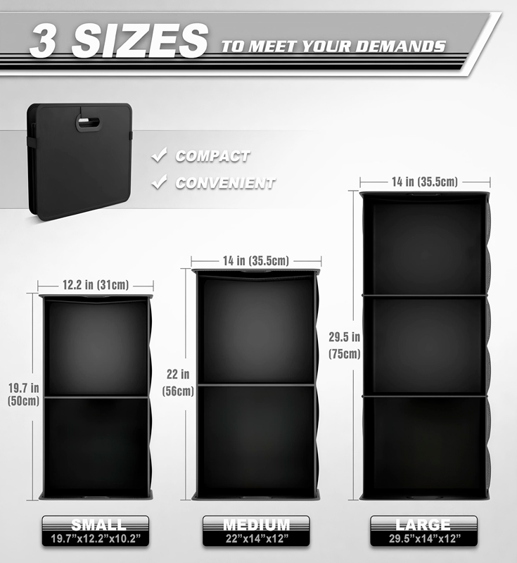 กระเป๋าเก็บท้ายรถกันน้ำแบบพับได้แบบพกพา 3 ขนาดสำหรับรถยนต์ทุกคัน มีให้เลือก 3 ขนาด หนึ่งในนั้นคือ 75x35.5x30.5 ซม. น้ำหนัก 1.45 กก. และบรรจุ 5 ชิ้นในกล่องเดียว ใช้ผ้า Oxford คุณภาพสูงพร้อมแผ่น PP หรือแผ่น MDF และใช้ซับใน 210D ด้านในซึ่งมีทั้งแข็งแรงทนทานและกันน้ำได้ดี การออกแบบพับทำให้ถุงเก็บของสามารถพับเก็บได้ง่ายเมื่อไม่ใช้งาน ประหยัดพื้นที่และพกพาสะดวก ไม่ว่าจะเป็นรถเก๋ง รถ SUV หรือรุ่นอื่นๆ ก็สามารถดัดแปลงได้อย่างง่ายดายและเป็นตัวเลือกที่เหมาะอย่างยิ่งสำหรับการจัดเก็บภายในและการจัดระเบียบ